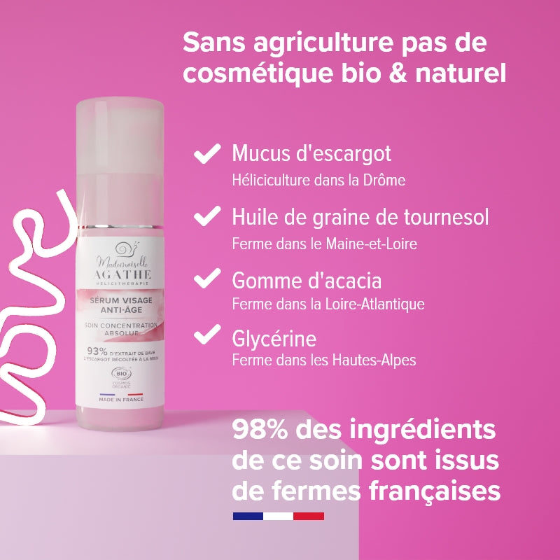 Bei der Herstellung kosmetischer Behandlungen spielt die Landwirtschaft eine zentrale Rolle. Die meisten Inhaltsstoffe unserer Helitherapy-Behandlungen stammen direkt von französischen Bauernhöfen, sei es Schneckenschleim von unserem Bauernhof in der Drôme, Sonnenblumenöl aus Maine-et-Loire oder sogar Akaziengummi aus der Loire-Atlantique.