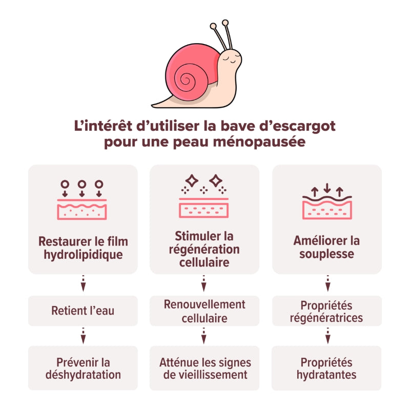 Unser Schneckenschleim-Extrakt ist dank seiner außergewöhnlichen Eigenschaften ein echter Verbündeter für trockene und reife Haut. Dieser natürliche Inhaltsstoff ist reich an Allantoin, Kollagen, Glykolsäure und Elastin, Wirkstoffen, die die Zellregeneration fördern, die Kollagenproduktion anregen und für eine intensive Feuchtigkeitsversorgung sorgen. Diese Komponenten sind besonders für die Haut in den Wechseljahren geeignet, da sie dabei helfen, den Hydrolipidfilm wiederherzustellen, Wasser zu speichern und die Geschmeidigkeit der Haut zu verbessern. Unsere Helicotherapeutic-Behandlungen wirken tiefgreifend, nähren und schützen die Haut und reduzieren gleichzeitig die sichtbaren Zeichen der Hautalterung.