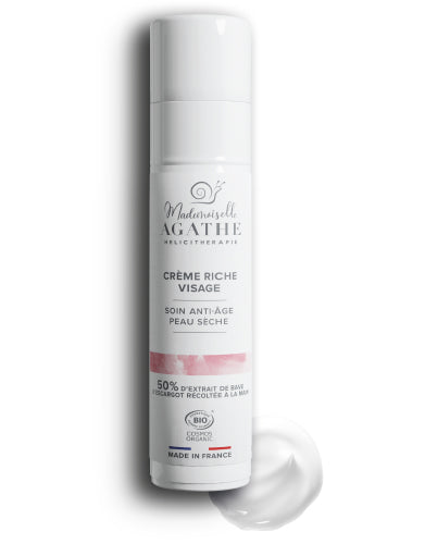 Unsere RICH CREAM ist für reife Haut sowie trockene bis sehr trockene Haut bestimmt, die eine intensive Ernährung benötigt. Unser Schneckenschleim ist in dieser Formel speziell mit ultranahrhaften Wirkstoffen angereichert, insbesondere: Bio-Sheabutter mit bemerkenswerten Eigenschaften zur Zellregeneration und zur beruhigenden Wirkung geschädigter Haut; Organisches pflanzliches Glycerin, das die Hydratation bewahrt; Bio-Aprikosenkern- & Sonnenblumenöle reich an Fettsäuren und essentiellen Vitaminen für die Haut; Bio-Pflanzenwachse aus der Kokosnuss tragen zur Geschmeidigkeit der Haut bei.
