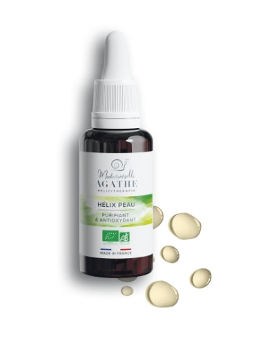 Helix-skin ist mit Schneckenschleim formuliert, der antioxidative Eigenschaften hat, dh er begrenzt die schädliche Wirkung freier Radikale. Die Vitamine A und E setzen ihre aktiven Anti-freien Radikale frei. Vitamin C seinerseits spielt eine Rolle bei der Kollagensynthese und auch beim Eisenstoffwechsel (Sauerstoffversorgung der Muskulatur), indem es dessen Aufnahme fördert. Es ist an mehreren hormonellen Mechanismen beteiligt. Es spielt auch eine Rolle bei der Ausscheidung von Giftstoffen. Es ist reich an Kollagen und Elastin, wichtige Verbündete für die Geschmeidigkeit und Elastizität der Haut. Diese ermöglichen es, Falten abzuschwächen, Dehnungsstreifen zu reduzieren und Akne und Hyperpigmentierung zu reduzieren.