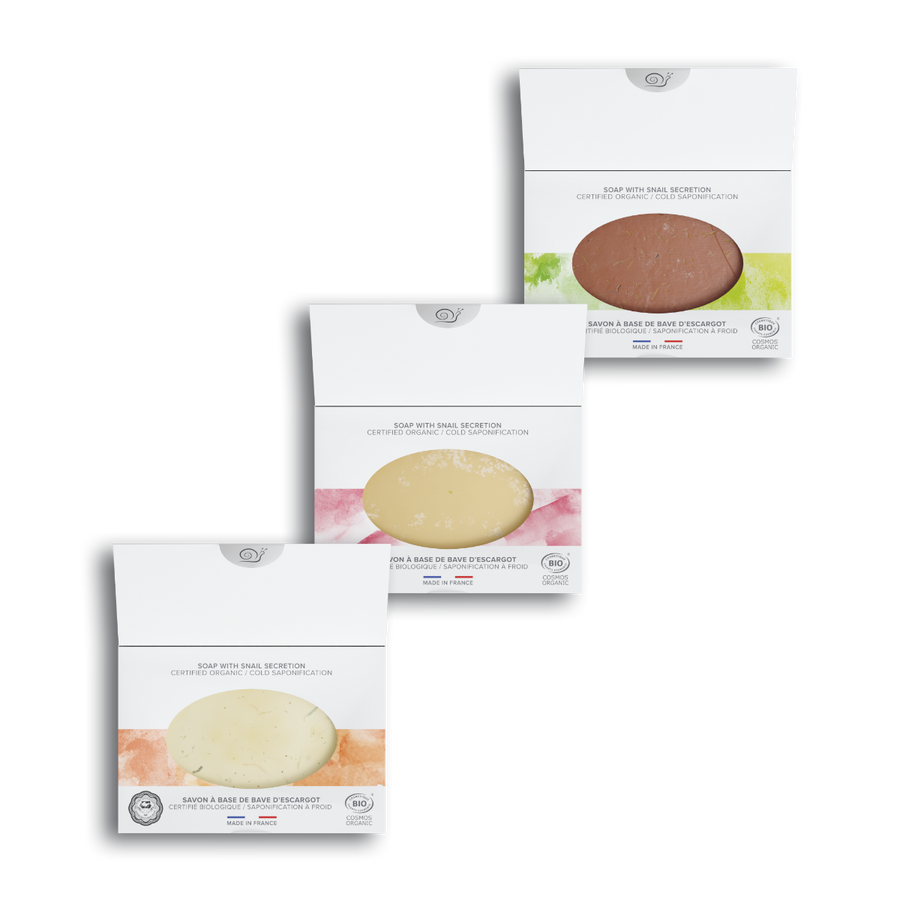 Mlle Agathe Seifen mit Schneckenschleim aus Kaltverseifung sind von Natur aus reich an Glycerin, das bei der Verseifungsreaktion entsteht. Es verleiht der Seife Weichheit und feuchtigkeitsspendende Eigenschaften. Eine handgemachte Seife, die durch Kaltverseifung hergestellt wird, enthält von Natur aus den nicht verseifbaren Anteil der verwendeten Öle und Butter, was ihr einzigartige Eigenschaften verleiht. Der Herstellungsprozess für Industrieseifen hingegen hat den unverseifbaren Anteil oft denaturiert oder sogar eliminiert. Wir haben uns für diese Methode entschieden, weil sie die Qualität der verwendeten Öle bewahrt und eine Seife ergibt, die sehr hautfreundlich und umweltschonend ist.